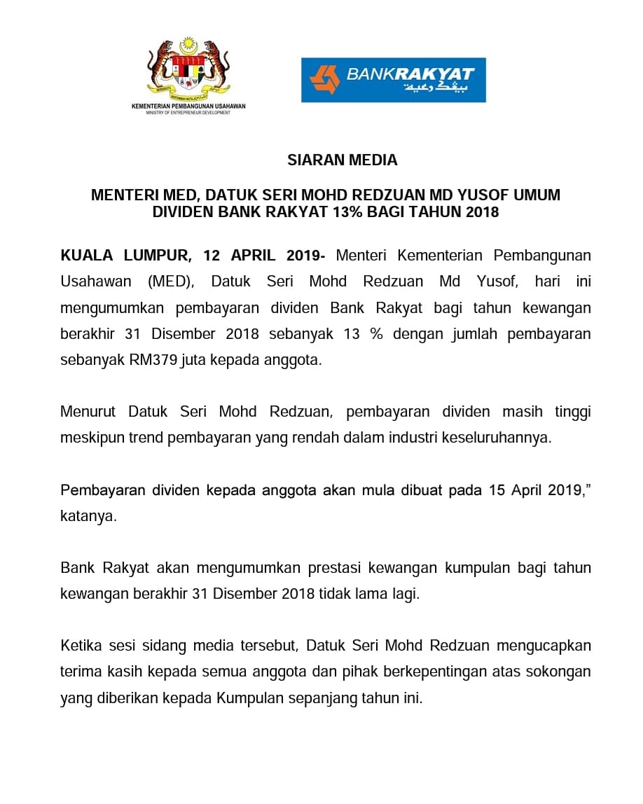 Dalam kenyataannya hari ini, bank rakyat yang juga agensi di bawah kementerian pembangunan usahawan berkata. Menteri pembangunan usahawan, datuk seri mohd redzuan md yusof, ketika mengumumkan perkara itu, hari ini, berkata pembayaran dividen masih tinggi walaupun. Modal dibenarkan bank rakyat adalah rm3 bilion, setakat 2019 kita sudah keluarkan rm2.99 bilion. Daftar pemegang saham berhak atas dividen tunai (recording date). Dividen bank rakyat terkini (2018).